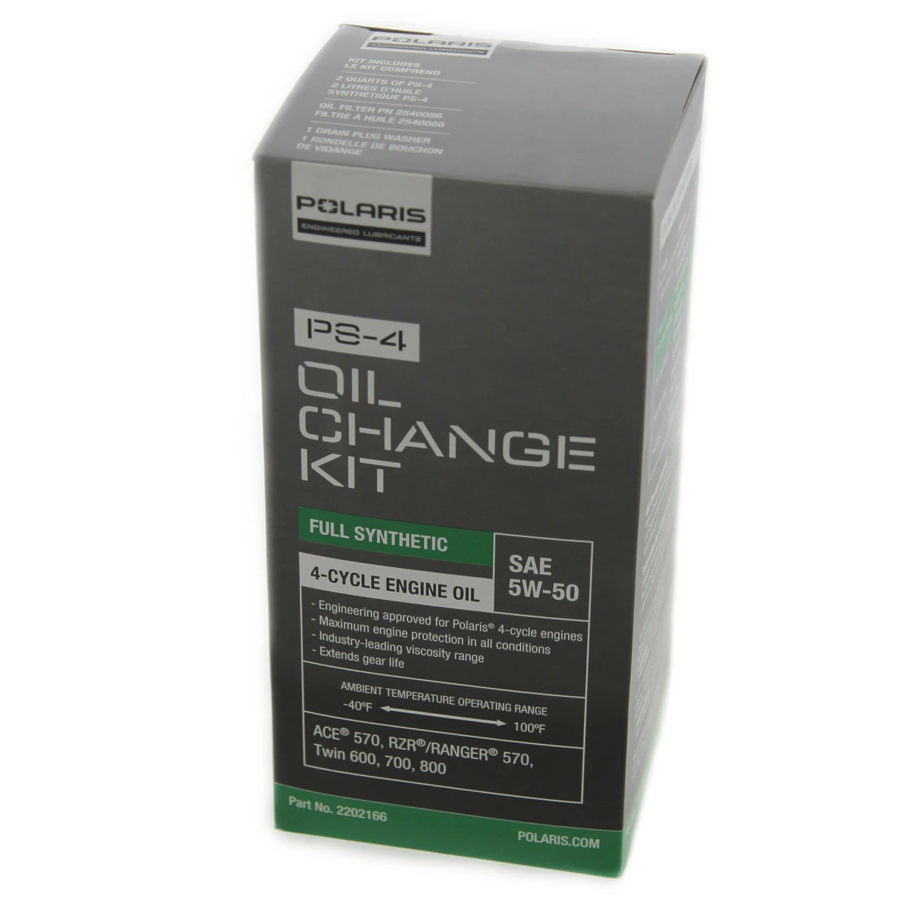 CUSTOM ADDITIVE SYSTEM: The Polaris – engineered additive system was formulated to reduce critical engine component wear, prevent oxidation in extreme temperatures and prevent rust and corrosion. OUTSTANDING PROTECTION AND PROVEN PERFORMANCE: PS – 4’s unique wi de 5W – 50 viscosity range provides critical engine protection in both low ambient temperatures and high ambient and internal engine temperatures, extending the life of your Polaris engine. INCLUDES EVERYTHING YOU NEED TO CHANGE YOUR OIL : 2 quart s of PS – 4 Ful l Synthetic 5W – 50 Engine Oil and 1 Polaris Oil Filter PN 2540086