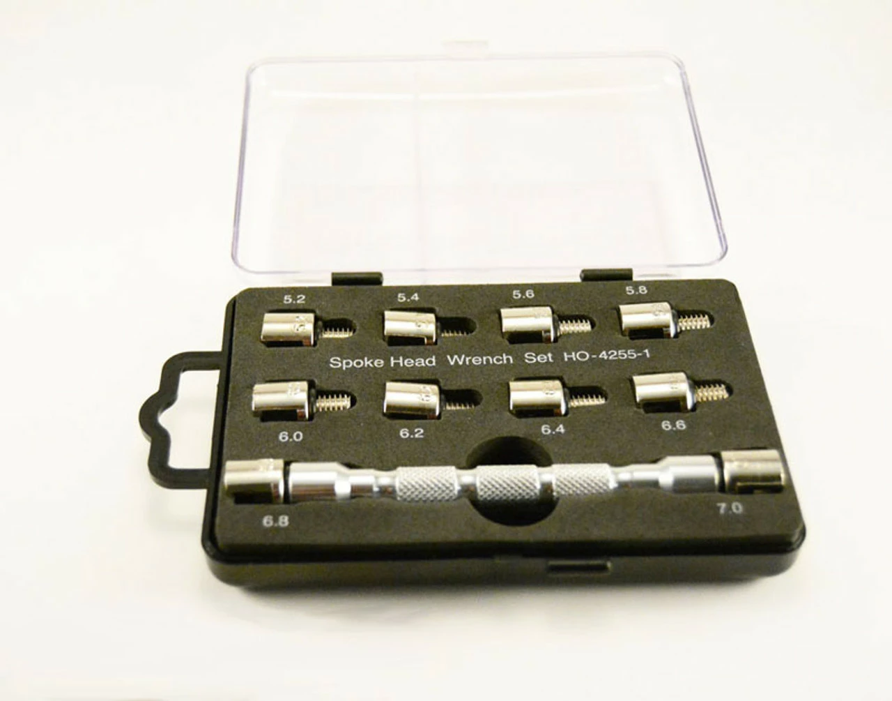 Race-Driven Pro Series Spoke Wrench Set features a knurled no slip handle wrench and 10 spoke heads that cover sizes 5.2-7.0. Our Pro Series set comes in a convenient hangable carrying case with identified slots for each head.