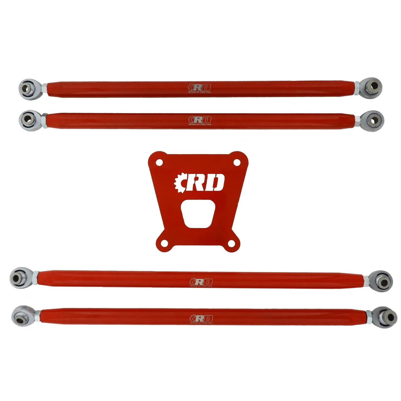 Race-Driven Red 1.125” Diameter 6061 Billet Aluminum Radius Rods with 4130 Chromoly rod ends that are heat treated for maximum strength that have self-lubricating and self sealing Nylafiber matrix race and rod plate made from 3/16” thick high strength ASTM A572-50 Steel. You will receive 4 rods and 1 plate that will fit: 2018 – 2021 Polaris RZR RS1. We manufacture the high-quality stainless-steel spacers to very tight tolerances for the best fit. These rods and plate have been quality powder coated by us in house, so custom colors are available upon request (extra charge for custom colors). These items are designed to withstand anything you can throw at them and are made to last. Designed to perfectly fit and replace the thin and weak OEM stock rods. Must use stock mounting hardware. Proudly made in the USA in Escanaba Michigan with a lifetime limited warranty* on non-wearable parts. *Not valid on machines with tires over 32″. May not work with some bumpers.