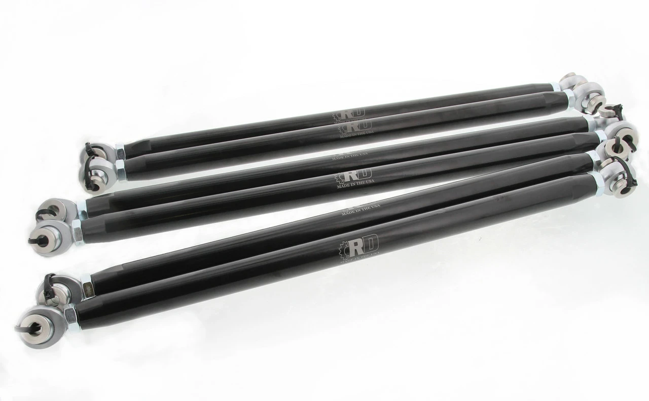 All NEW Race-Driven Black 1.125” Diameter 6061 Billet Aluminum Radius Rods with 4130 Chromoly rod ends that are heat treated for maximum strength that have self-lubricating and self sealing Nylafiber matrix race. You will receive 6 rods that will fit: 2017 – 2021 Can-Am Maverick X3 64″. We manufacture the high-quality stainless-steel spacers to very tight tolerances for the best fit. These will outlast the weak aluminum spacers other companies use. These Rods have been quality powder coated by us in house, so custom colors are available upon request (extra charge for custom colors). These Rods are designed to withstand anything you can throw at them and are made to last. Designed to perfectly fit and replace the thin and weak OEM stock Rods. Must use stock mounting hardware. Proudly made in the USA in Escanaba Michigan with a lifetime limited warranty* on non-wearable parts. *Not valid on machines with tires over 32″. May not work with some bumpers. OEM# 706002136 706002099 706002139