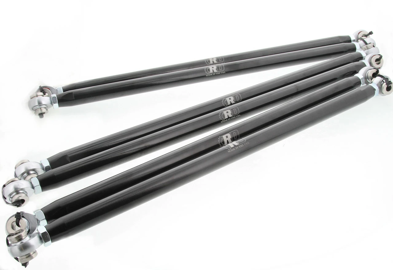 All NEW Race-Driven Black 1.125” Diameter 6061 Billet Aluminum Radius Rods with 4130 Chromoly rod ends that are heat treated for maximum strength that have self-lubricating and self sealing Nylafiber matrix race. You will receive 6 rods that will fit: 2017 – 2021 Can-Am Maverick X3 72″. We manufacture the high-quality stainless-steel spacers to very tight tolerances for the best fit. These will outlast the weak aluminum spacers other companies use. These Rods have been quality powder coated by us in house, so custom colors are available upon request (extra charge for custom colors). These Rods are designed to withstand anything you can throw at them and are made to last. Designed to perfectly fit and replace the thin and weak OEM stock Rods. Must use stock mounting hardware. Proudly made in the USA in Escanaba Michigan with a lifetime limited warranty* on non-wearable parts. *Not valid on machines with tires over 32″. May not work with some bumpers.